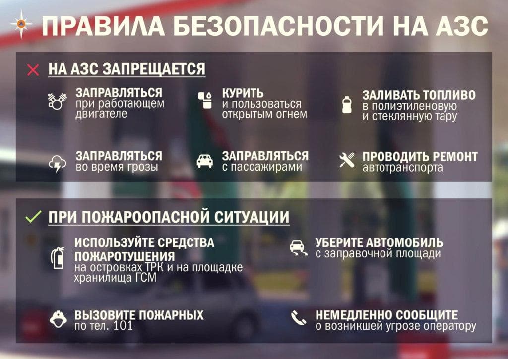 - заправку автомобиля необходимо осуществлять со стороны бензобака; - при заправке необходимо заглушить двигатель автомобиля; - категорически запрещено курить и пользоваться открытым огнем; - запрещено сливать бензин в стеклянную тару; - загрязнённые участки от топлива, а также нефтепродуктов на поверхности транспорта до заправления вытираются обязательно досуха; - пролитые на землю нефтепродукты немедленно посыпаются песком, в дальнейшем собираемым и вывозимым за станцию (при пролитии топлива либо нефтепродуктов, водитель обязан сообщить об этом оператору автозаправочной станции); - стоящие в порядке очереди на заправку автомобили располагаются на расстоянии, составляющем не менее 1 метра друг за другом.
