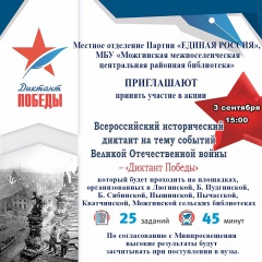 3 сентября 2020 г. в Можгинском районе пройдет акция «Диктант Победы» на 7 площадках (в Люгинской, Б. Пудгинской, Б. Сибинской, Нышинской, Пычасской, Кватчинской, Можгинской сельских библиотеках).