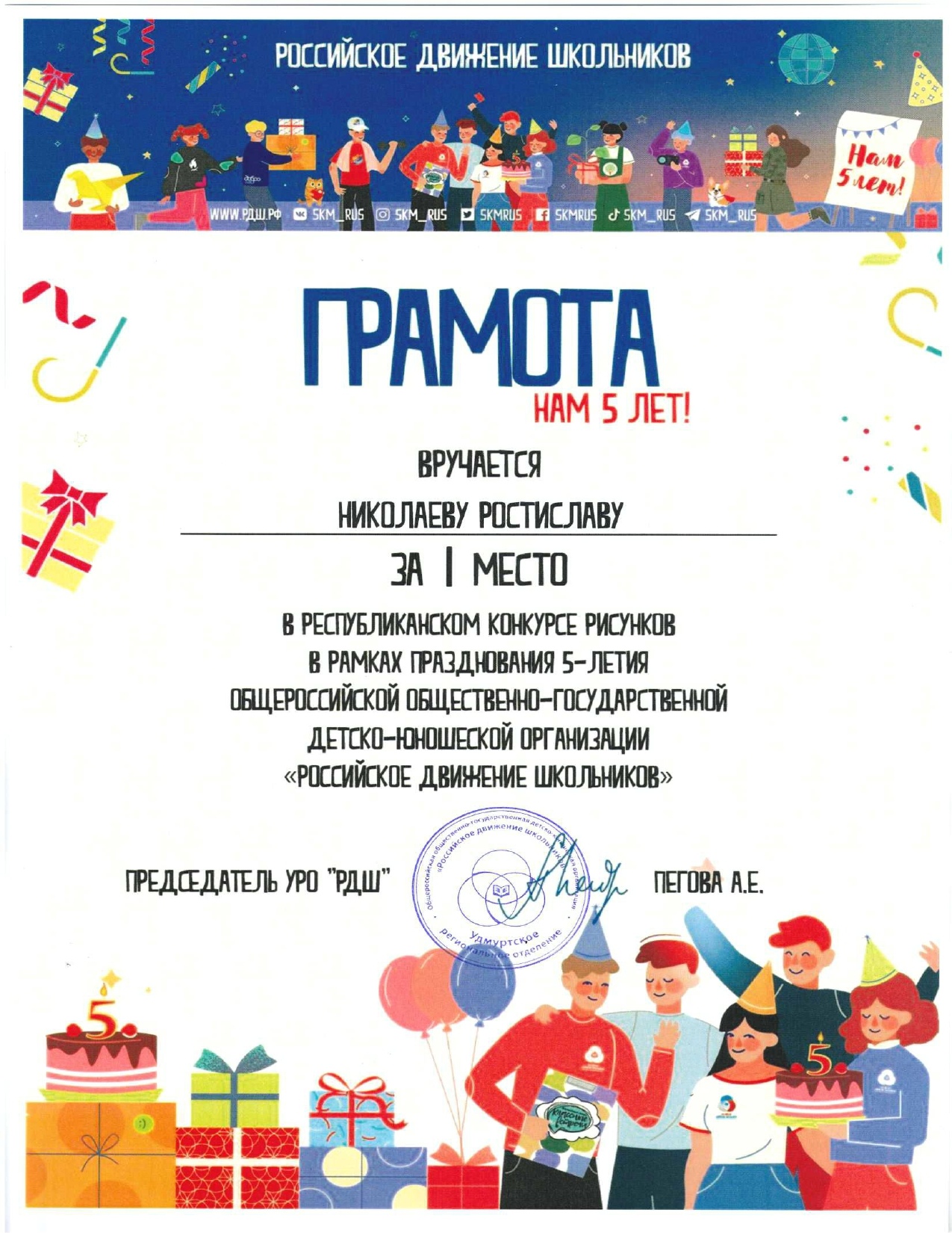 Ура! В копилке активистов РДШ Можгинского района новая победа!В рамках празднования 5-летия Общероссийской общественно-государственной детско-юношеской организации "Российское движение школьников", активисты Кватчинской школы Николаев Р. и Маловаложикьинской школы Гоголева Д. заняли 1 место в республиканском конкурсе рисунков и открыток.