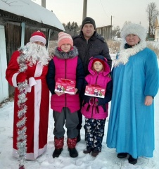 По лесам дремучим, по долам широким, по морям глубоким, по горам высоким не на оленях, не на тройке лошадей, не на ковре-самолёте, а на ТЮБИНГЕ добрался Дед Мороз со Снегурочкой к детям из многодетных семей д.Мельниково и привез новогодние подарки. Свои подарки получили и ребята из д. Старый Березняк |