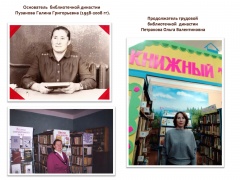 Династия Пузановых-Петраковых – победители муниципального этапа конкурса в номинации «За преемственность поколений». Их стаж в библиотечной отрасли составляет почти 50 лет. Труд библиотекаря совсем не прост, как кажется на первый взгляд. Но все трудности можно преодолеть, если делать свое дело с душой и по призванию. Это можно сказать и о Галине Григорьевне Пузановой – основателя библиотечной династии Пузановых – Петраковых из села Русский Пычас. Свой творческий путь от старшего библиотекаря до заведующей сельской библиотекой Галина Григорьевна прошла достойно. Более тридцать лет она помогала найти читателям свою дорогу в сказочный, удивительный мир книг и старалась сделать свою библиотеку уютной, по-домашнему желанной, располагающей и к серьезным занятиям, и к душевному общению. Продолжателем трудовой библиотечной династии стала дочь Ольга. Как рассказывает сама Ольга Валентиновна: «Мои родители с детства привили любовь к книге и чтению. Посещая библиотеку, где работала моя мама, мы всегда уходили домой с новой и интересной книгой. С нетерпением ждали наступления вечера, старались помочь маме сделать поскорее дела, чтобы приблизить время чтения сказки перед сном. В 2004 году я приступила к должности заведующей Русскопычасской сельской библиотекой и нисколько об этом не жалею. Мне нравится осваивать новые технологии и методики библиотечной работы, проводить различные мероприятия и, конечно же, общаться с читателями. Каждый раз, переступая порог своей библиотеки, вглядываясь в небольшое, но по-домашнему уютное библиотечное пространство, на душе становится тепло от улыбок своих читателей». |