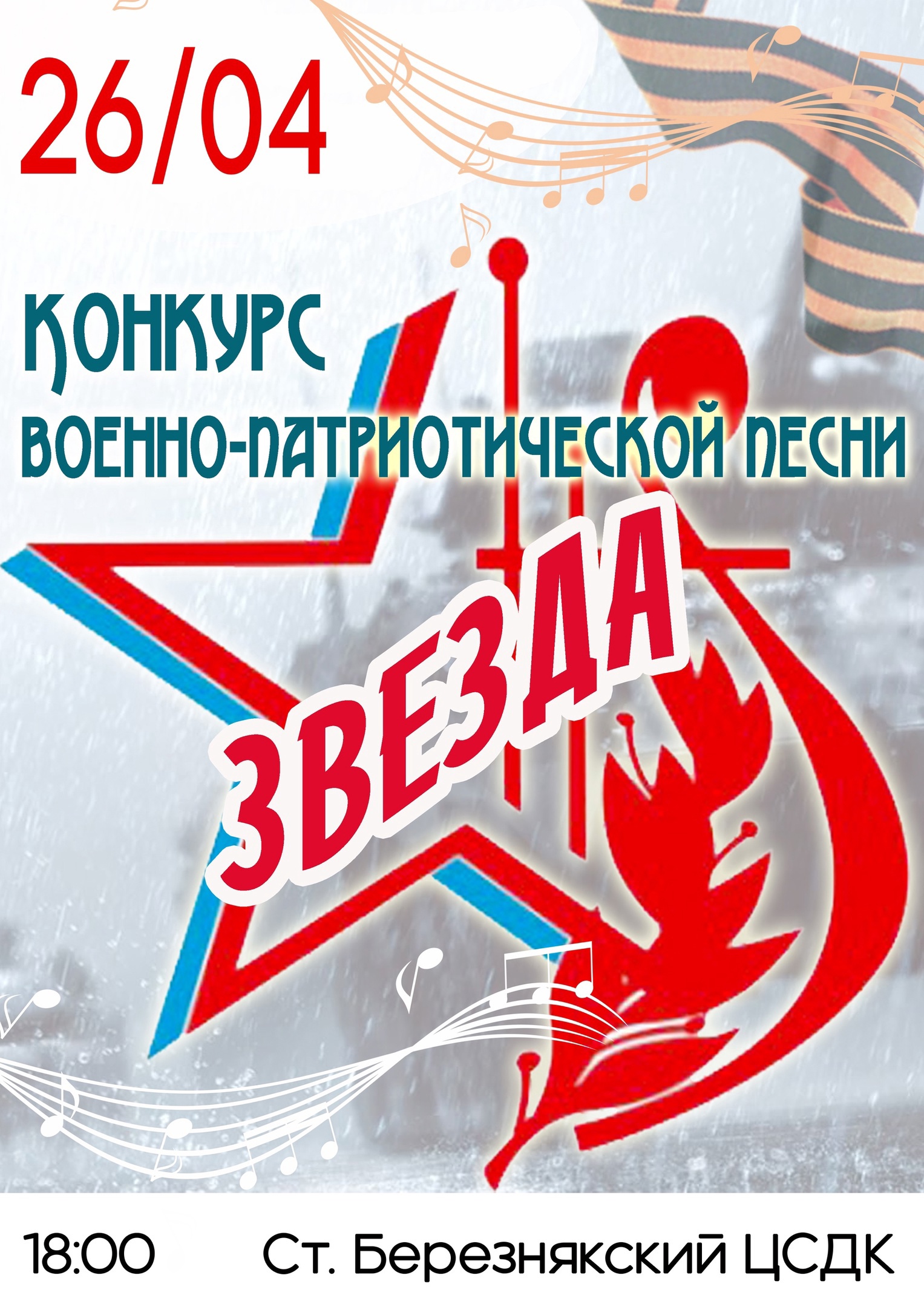 От участника – 1 номер. НОМИНАЦИИ: – сольное пение – малые формы (дуэт, трио) – ансамбли Для участия в конкурсе до 22 апреля подать ЗАЯВКУ на адрес : mbu-cks@yandex.ru с пометкой ЗВЕЗДА ![]() |