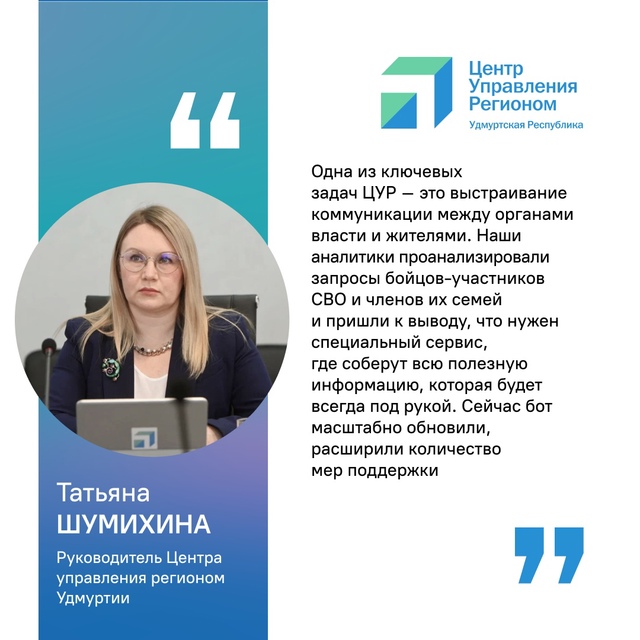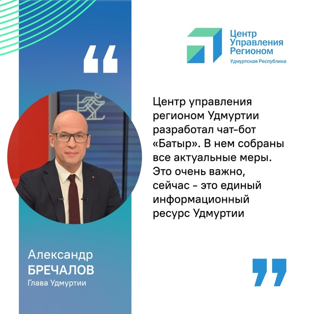 Глава Удмуртии Александр Бречалов в прямом эфире рассказал, что все меры поддержки, которые существуют в республике, заведены в чат-бот ВКонтакте и Телеграм. Его разработкой занимался Центр управления регионом республики. Имя боту выбрано не случайно, «Батыр» с удмуртского языка переводится – «богатырь», «силач», «герой».
