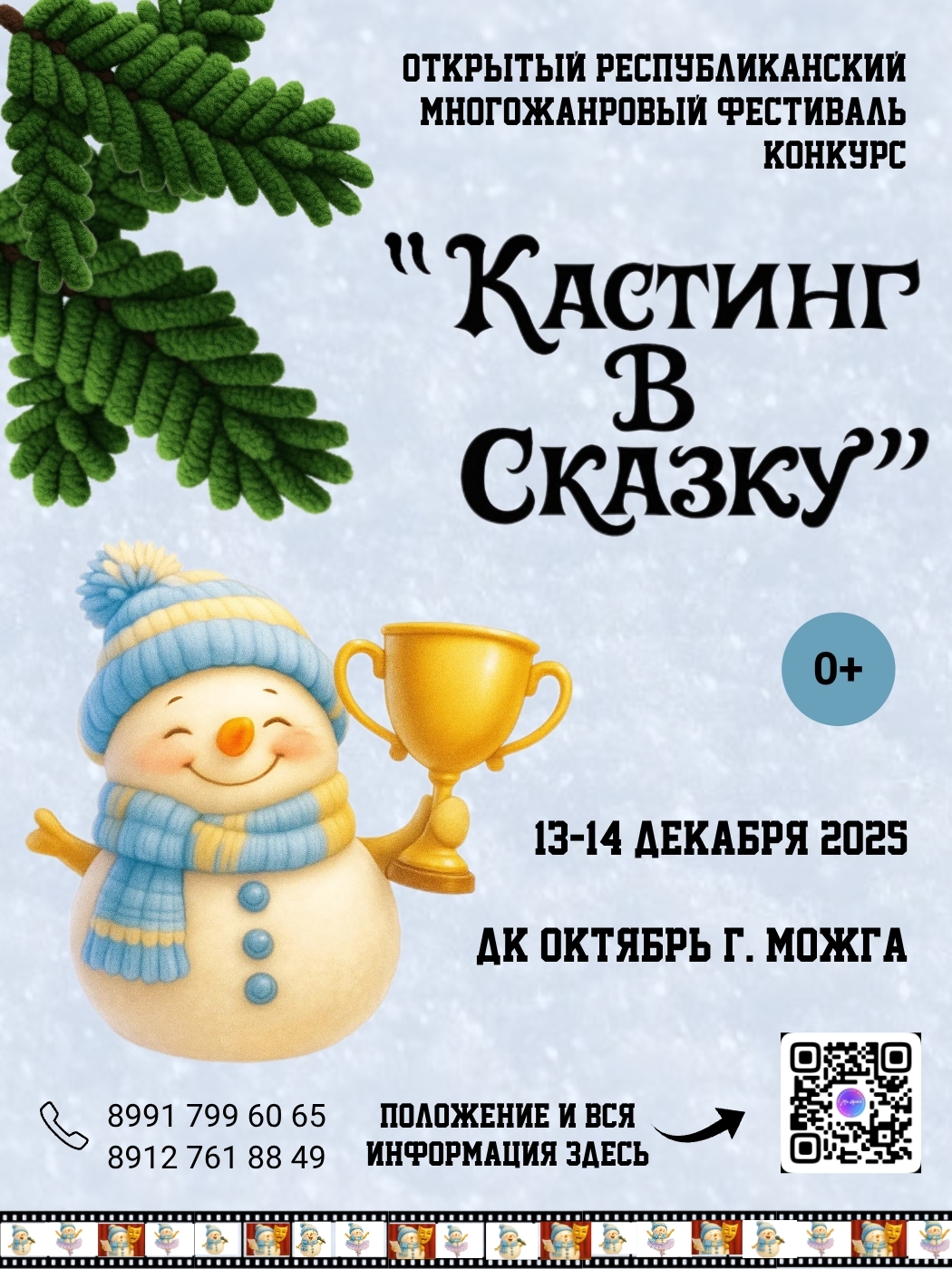Дорогие друзья!Приглашаем вас окунуться в настоящую зимнюю сказку уже 13–14 декабря 2025 года в городе Можга на Открытый Республиканский фестиваль-конкурс «Кастинг в сказку»!14 декабря 2025 года – театральное искусство, хореография, музыкально-исполнительское искусство, оригинальный жанр Лауреаты и Дипломанты получат медали и дипломы, а самые яркие — кубки и звание Гран-при! Заявки принимаются до 3 декабря! Удмуртская Республика, г. Можга, пер. Чапаева, д. 8 Подать заявку можно в группе vk.com/miarteproekt или на почту: miarte75@mail.ru Давайте вместе создадим праздник, который запомнится надолго! Положение о проведении фестиваля-конкурса (скачать pdf).