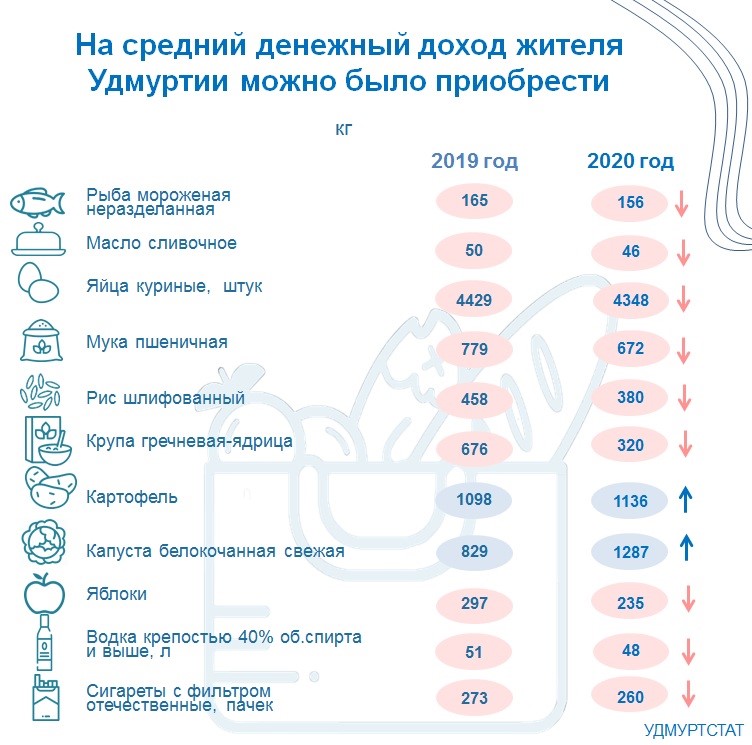 25443 рубля - таков средний денежный доход жителей Удмуртии в 2020 году. В реальном выражении (с учетом инфляции) это на 2,2% меньше, чем годом ранее. Три четверти денежных доходов население потратило на покупку товаров и оплату услуг (в 2019 году - 79%). Покупательная способность денежного дохода в отношении некоторых товаров (говядина, сахар-песок, картофель, капуста белокочанная свежая) в 2020 году повысилась в сравнении с прошлым годом. Вместе с тем, рост цен на отдельные товары опережал рост доходов. Многие продукты (рыба мороженая неразделанная, мука пшеничная, хлеб и булочные изделия из пшеничной муки 1 и 2 сортов, масло сливочное, молоко питьевое цельное пастеризованное 2,5-3,2% жирности, крупа гречневая-ядрица, рис шлифованный, яблоки, а также водка крепостью 40% об. спирта и выше, и сигареты с фильтром отечественного производства стали менее доступны массовому покупателю, чем в 2019 году.