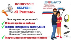 2. Селфи (фотографии, фотоработы) необходимо сделать на фоне плакатов с надписью: «2018 МАРТЭ РОССИЯЛЭСЬ ПРЕЗИДЕНТСЭ БЫРЪЕНЪЕС» 3. Закачать эту фотографию в альбом Конкурс СЕЛФИ "Я Решаю!" в группе ВК Молодежка. Можгинский район (https://vk.com/molodezkanaraione) с 08 ч. 00 мин. по 20 ч. 00 мин. 18 марта 2018 года!