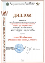 Подведены итоги республиканского профильного конкурса "Провинциальные семейные чтения. Добрый мир любимых книг", целью которого стало возрождение традиций семейного чтения, как средства развития и укрепления семьи и семейных ценностей. В муниципальном этапе, который объявила Можгинская районная библиотека, приняло участие 8 семей Можгинского района. По результатам, участниками республиканского этапа стали семья Щербаковых (Можгинская сельская библиотека), семья Александровых (Пазяльская сельская библиотека) и семья Воронцовых (Б. Учинская сельская библиотека). Участникам предстояло создать рекламный ролик «Сундучок семейных ценностей», в котором они рассказали о своей семье, обычаях и традициях, которые их объединяют. А также создать творческую работу «Литературная палитра» по страницам любимых книг, которые могли бы повлиять в воспитании ребёнка как личности. В преддверии Дня матери стали известны результаты республиканского этапа, по итогам которых семья Щербаковых стала финалистом данного конкурса и была удостоена Дипломом и ценными подарками. Остальные семьи отмечены Дипломами участника. Хочется выразить слова благодарности в адрес Можгинской, Пазяльской, Большеучинской сельских библиотек, за подготовку и поддержку семей-участниц. |